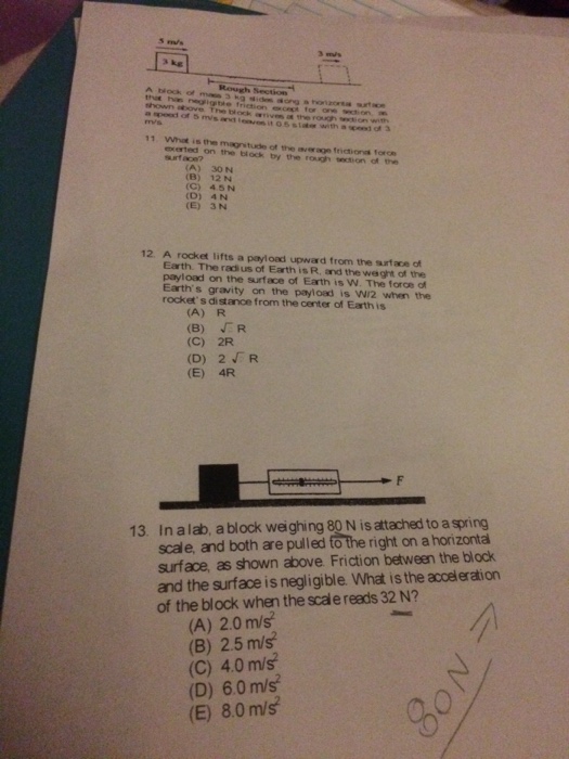 . In a lab a block weighing 80 N is attached to a spring scale and both are pulled to the right on a horizontal surface as shown above. Question 2 In a lab a block weighing 80 N is attached to a spring scale and both are pulled to the right on a horizontal surface as shown above. Friction between the block and the surface is negligible.